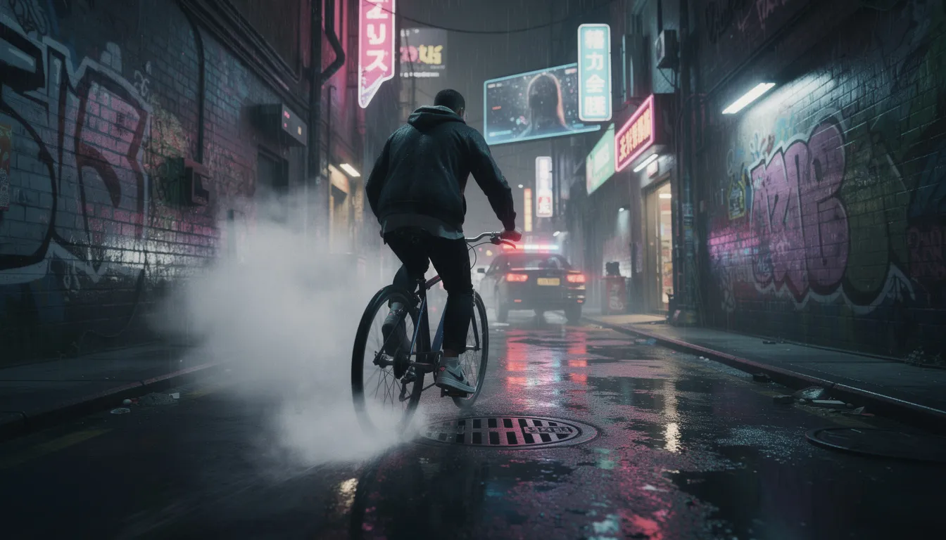 A man cycling through a neon-drenched alleyway, his reflection shimmering on slick pavement, the only sound the whir of his chain against the hum of the city. A plume of steam rises from a manhole cover, briefly obscuring the graffiti-scarred walls, as he pedals faster, pursued by the distant wail of sirens.
