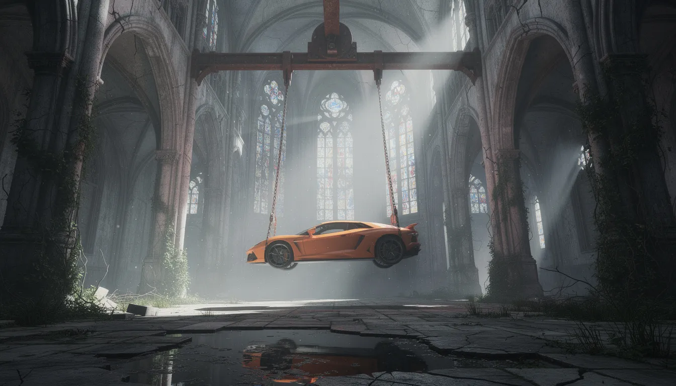 A surreal cinematic scene set inside a vast, abandoned gothic cathedral with towering stone arches, cracked walls, and tall stained-glass windows diffusing cold, misty daylight. Suspended in mid-air at the center of the nave is a bright orange sports car, lifted by heavy chains and a metal hoist frame attached to the vaulted ceiling. The car hangs perfectly horizontal, emphasizing tension and impossibility. Moss, vines, and creeping vegetation reclaim the ancient stone interior, while puddles on the cracked stone floor reflect the cathedral’s architecture and the floating vehicle above. The contrast between the modern, glossy supercar and the decaying medieval environment creates a striking visual juxtaposition. Lighting is soft but dramatic, with volumetric light rays cutting through dust and fog, evoking a mood of mystery, surrealism, and post-apocalyptic elegance. Highly detailed, cinematic realism with a dark, contemplative atmosphere.