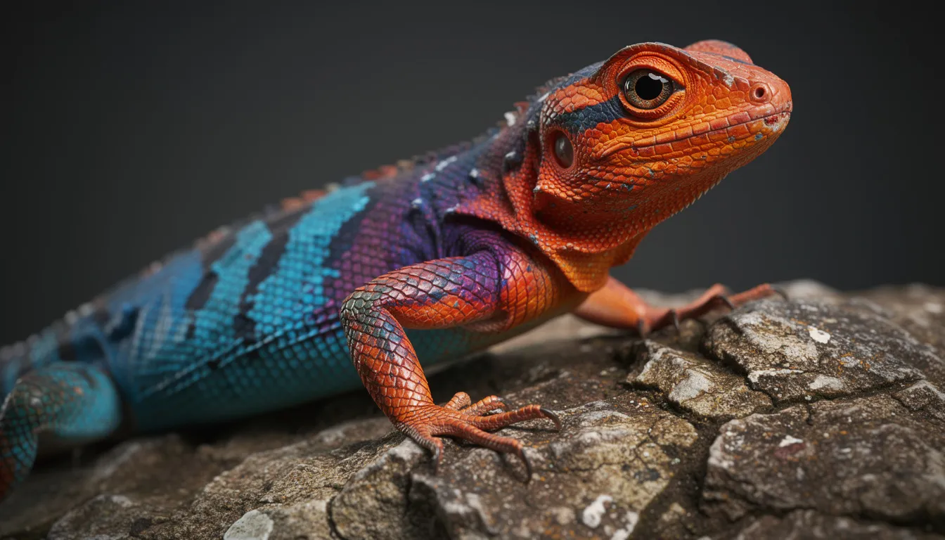 FLUX.2 ProA striking close-up portrait of a vividly colored lizard perched on a textured rock, captured at eye level with shallow depth of field. The reptile features an extraordinary gradient of saturated hues—electric blue scales along the body, fiery orange and red tones on the head and limbs, and subtle purple transitions across the neck and torso. Fine scale textures are sharply detailed, with glossy highlights catching the light. One large, reflective eye is in crisp focus, conveying alertness and curiosity. The background fades into a dark, softly blurred gradient, isolating the subject and enhancing contrast. Lighting is dramatic yet controlled, emphasizing color vibrancy and surface detail. The overall mood is bold, exotic, and visually arresting, ideal for wildlife art, fantasy realism, or high-end digital illustration.InteriorAtmosphericDepth of field