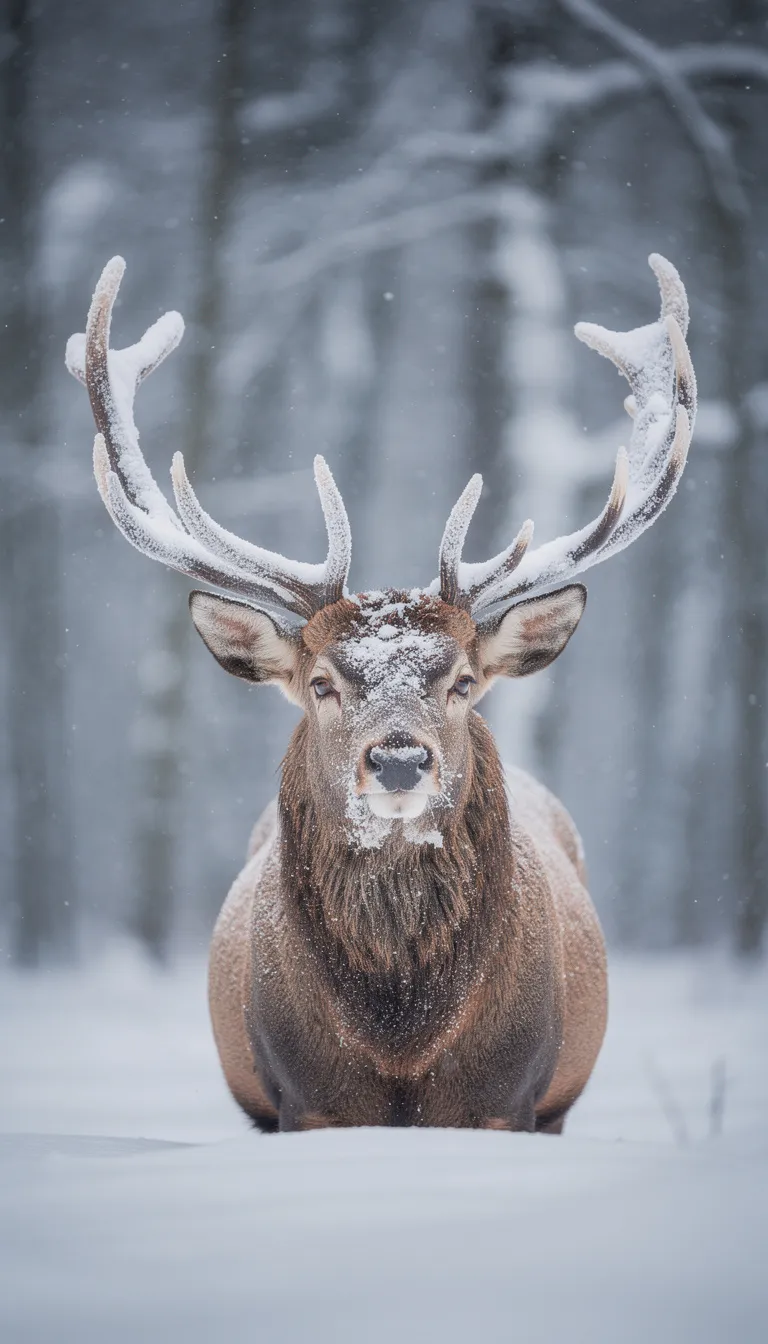 A close-up wildlife portrait of a majestic stag standing still in a snowy forest during active snowfall. The deer faces the camera directly, with large symmetrical antlers coated in fresh snow, creating a striking and powerful composition. Its fur is a rich warm brown, lightly dusted with snowflakes, contrasting against the soft white foreground and cool gray-blue background. The background features blurred winter trees with shallow depth of field, producing a dreamy, atmospheric bokeh effect. Lighting is soft and diffused, typical of overcast winter conditions, emphasizing fine details in the fur, antlers, and snow texture. The mood is calm, serene, and slightly dramatic, evoking wilderness, nature, and seasonal beauty. Shot at eye level with a centered composition, high realism, no text, ideal for commercial wildlife, winter, or holiday-themed stock imagery.